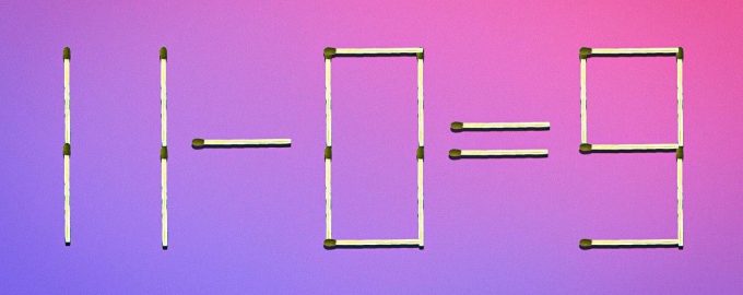 Vous avez devant vous une éqion incorrecte : 11-0=9. Elle est construite à partir de 19 allumettes. Il suffit de déplacer une allumette pour que l’éqion devienne correcte.